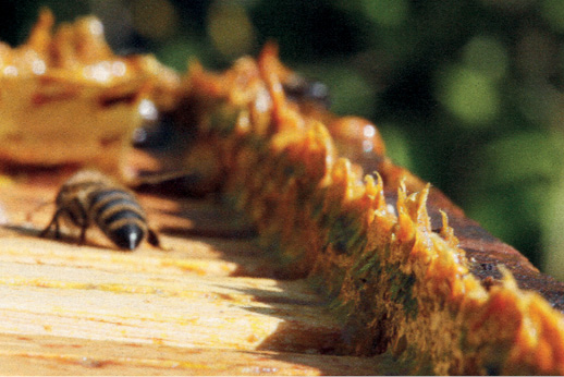 Wosk pszczeli jest także dodawany do propolisu, który służy do wypełniania nieszczelności gniazda lub wzmacniania jego konstrukcji (Fot. 9). W surowym propolisie, obok żywic, olejków eterycznych, pyłku kwiatowego i innych składników znajduje się od 12 do 40% wosku pszczelego [5].