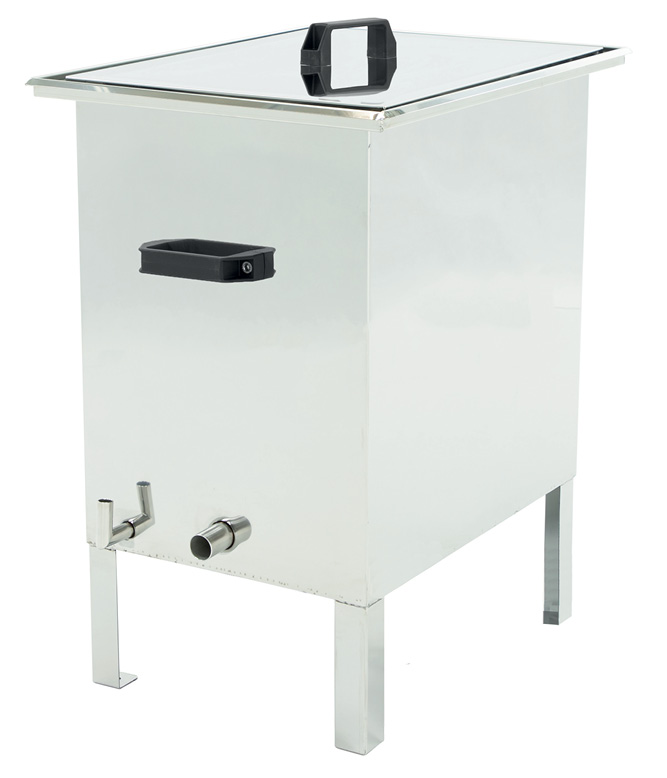 W pasiekach dość szeroko stosowane są również do wytapiania wosku topiarki parowe (fot. 17). W tego typu sprzętach para wodna wytwarzana jest w wytwornicach, które znajdują się wewnątrz lub na zewnątrz urządzenia. Surowiec woskowy umieszcza się w specjalnym koszu, gdzie pod wpływem pary wodnej stopniowo się wytapia, a wosk gromadzi w dolnej części urządzenia, skąd można go zlać przez specjalny zawór. Stamtąd trafia do odstojnika w kształcie odwróconego stożka wypełnionego wodą, gdzie pozostaje aż do zastygnięcia. Następnie wosk usuwa się z odstojnika po jego odwróceniu.