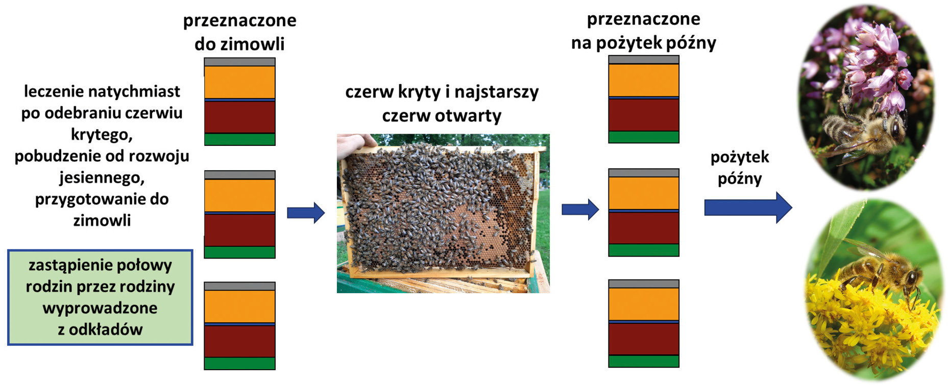 Moim zdaniem w przypadku stosowania zintegrowanej walki z warrozą zależnie od pory sezonu oraz siły rodzin można odebrać tylko czerw kryty i najstarszy czerw otwarty. W ten sposób także odbierzemy roztocza ukryte w komórkach z czerwiem nie osłabiając tak znacznie rodzin. Wtedy czas odbudowy ich siły byłby krótszy. Metodę tę można rekomendować także pszczelarzom wykorzystującym pożytki późne, ponieważ odkłady zbiorcze utworzone z usuniętego z rodzin czerwiu mogą zastać przeznaczone do wykorzystania pożytku późnego, postępując podobnie jak Pan Czesław Jung (patrz rozdział 10.1. Rotacyjna gospodarka pasieczna), z tą różnicą, że w tym przypadku pożytek będą wykorzystywać odkłady a nie rodziny gospodarcze.