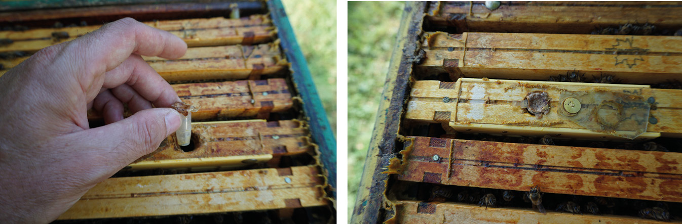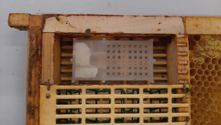 Natomiast w przypadku, gdy terminem wymiany matek jest jesień a matki chcemy przetrzymywać w izolatorach przez całą zimowlę można już we wrześniu zabrać starą matkę z rodziny a młodą czerwiącą poddać w klateczce do wnętrza izolatora. W ten sposób jesienią matki poddają belgijscy pszczelarze. Do wnętrza izolatora Chmary z powodzeniem mieści się klateczka trapezowa (fot. 30.). Pszczoły uwalniają wtedy matkę w izolatorze. Do wykorzystywanych w pasiece uniwersyteckiej izolatorów sekcyjnych oraz izolatorów zintegrowanych z plastrem poddajemy matki w sztucznych matecznikach sporządzonych z probówki typu Eppendorf o pojemności 1,5 ml. Z takiej próbówki odcina się wieczko i kawałek stożkowatego dna tak, aby powstały w ten sposób otwór umożliwiał matce opuszczenie probówki – jego średnica nie była zbyt mała (fot. 31.). Przed wpuszczeniem matki do takiego sztucznego matecznika mniejszy otwór, powstały wskutek odcięcia dna próbówki zaklejamy kawałkiem matecznika, z którego wygryzła się matka. Zaklejając go dbamy o to, aby pozostawić małą szczelinę, przez którą do wnętrza będzie dostawało się powietrze, w przeciwnym razie matka się udusi. Następnie otworem z drugiej strony wpuszczamy matkę i zaklejamy go szczelnie także kawałkiem matecznika (fot. 32.). W pasiece uniwersyteckiej prowadząc wychów matek mamy do dyspozycji sporo wygryzionych mateczników, które zbieramy, jednak przy ich braku można posłużyć się kawałkiem węzy lub wosku oderwanego z plastra. Sztuczny matecznik z matką jest umieszczany w otworze do wpuszczania matki, wywierconym w górnej beleczce ramkowej nad komorą izolatora (fot. 33.). Do izolatora zintegrowanego z plastrem (fot. 7.) można także poddać matkę w klateczce. Klateczkę z matką poddajemy wtedy do komory izolatora (fot. 34.) przez przestrzeń powstałą po usunięciu fragmentu kraty odgrodowej wykorzystywanego do umożliwienia matce wyjścia z izolatora (fot. 10.). Aby klateczka się zmieściła należy odciąć górną cześć siatki wypełniającej wnętrze komory izolatora. Po usunięciu klateczki ten fragment siatki umieszczamy ponownie w izolatorze, aby zapobiec zabudowywaniu komory izolatora. Do komory izolatora można podać także matkę w sztucznym mateczniku. Poddawanie w klateczce jest alternatywą dla pszczelarzy, którzy mają problem z umieszczeniem matki w sztucznym mateczniku.