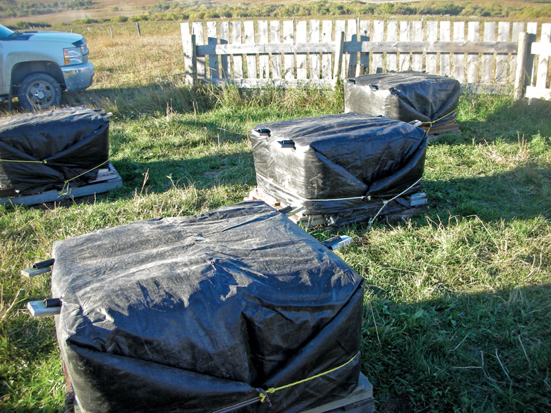 Na pasiekach rozkładane są trutki na myszy, a palety z ulami starannie obwiązywane specjalnymi matami z wywietrznikami (fot. 3.). Od początku listopada silne rodziny są gotowe go zimowania i nie niepokoi się ich już więcej. Zimowlę znoszą dobrze, nawet przy dużych kanadyjskich mrozach.