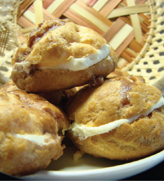 Po ostudzeniu przekroić każde ciastko i wypełnić kremem. Można posypać cukrem pudrem lub udekorować polewą czekoladową.