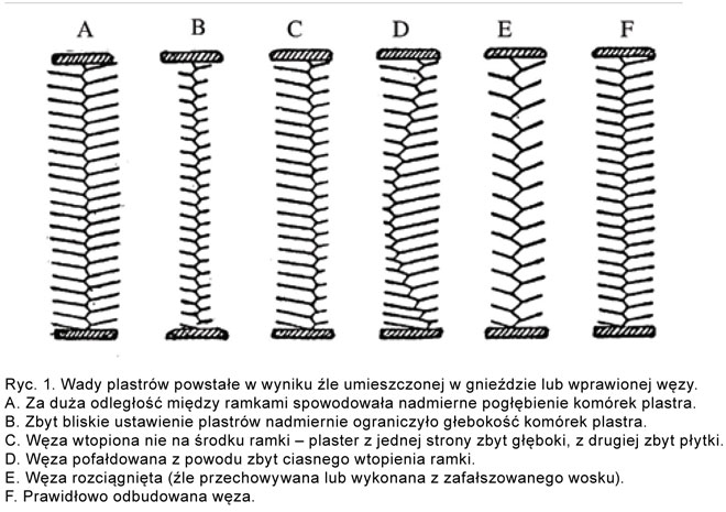 Jak już wspomniano wcześniej, plastry, które wycofujemy mają najczęściej zbyt głębokie lub zbyt płytkie komórki albo zbyt pogrubione lub zbyt cienkie. Przyczyną może być nie zachowanie prawidłowej odległość pomiędzy ramkami albo nieprawidłowe osadzenie węzy w ramce (ryc. 1.). Węzę wprawiamy w osi środkowej ramki. W przeciwnym razie odbudowany plaster będzie miał komórki z jednej strony zbyt głębokie, a z drugiej zbyt płytkie (ryc. 1.c). Podobny efekt uzyskamy, gdy węza ulegnie silnemu pofałdowaniu (ryc. 1.d). Matka nie zaczerwi plastrów, w których na skutek rozciągnięcia się węzy komórki zdeformowały się (ryc. 1.e). Do uszkodzenia węzy może dojść podczas transportu lub złego przechowywania. Nie może być ona narażona na działanie wysokich temperatur, gdyż sprzyja to jej odkształceniu i zdeformowaniu komórek. Nie może być przesiąknięta obcym zapachem, gdyż wówczas niechętnie jest odbudowywana przez robotnice. Do zaczerwienia przez matkę nie nadają się także plastry uszkodzone przez barciaka czy plastry ze spleśniałą pierzgą lub sfermentowanym pokarmem (fot. 2., 3., 4.).