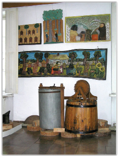 Oddzielna grupa, to „centerfugi” bębnowe. Pośród nich, wykonanych z blachy i z zastosowaniem rozmaitych ręcznych mechanizmów napędowych (przekładni z napędem korbowym), szczególną uwagę, poprzez swą odmienność, zwraca miodarka niemal całkowicie wykonana z drewna (metalowe są jedynie oś, korba i siatki dwuplastrowego kosza). Co ciekawe, jest to konstrukcja wtórna wobec wcześniejszych blaszanych poprzedniczek, popularyzowanych w literaturze pszczelarskiej od czasów mjra Franciszka Hruszki, wynalazcy tego urządzenia. Władysław Łukasiewicz z Brzeźnicy – wykonawca naszej miodarki – spełnił swoje dzieło około 1950 r. Nie wiadomo, czy nie dysponował innymi materiałami, czy wiodła go siła tradycji, w każdym razie na korpus miodarki przeznaczył bednarskiej roboty faskę. O ile takie rozwiązanie było gdzieniegdzie spotykane, o tyle zupełnie oryginalnym rozwiązaniem jest archaiczny mechanizm napędowy stanowiący zminiaturyzowaną kopię mechanizmów poruszających wiatraki (twórca miodarki był także ich budowniczym).