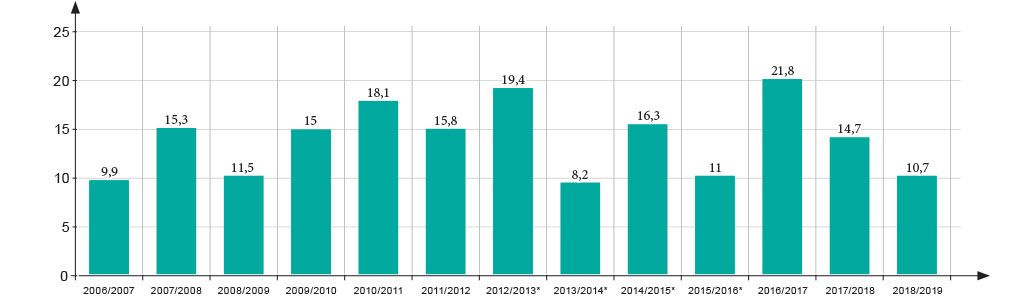 Rycina 2. Ogólne straty rodzin pszczelich w Polsce w latach 2006-2019.
