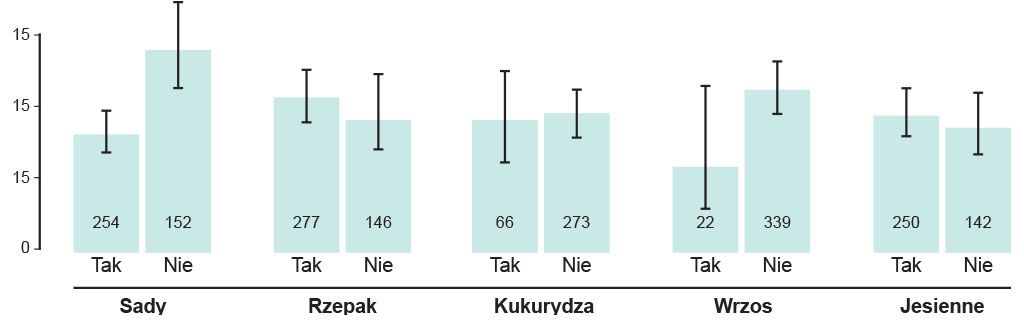 Rycina 3. Odsetek strat zimą 2018/19 w odniesieniu do korzystania przez pszczoły z sadów, rzepaku, kukurydzy, wrzosu, pożytków jesiennych lub rzepaku.