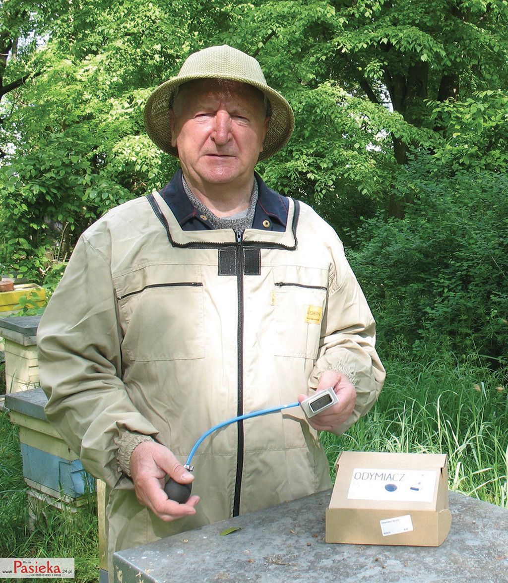 Alfred Molęda z odymiaczem własnej konstrukcji.