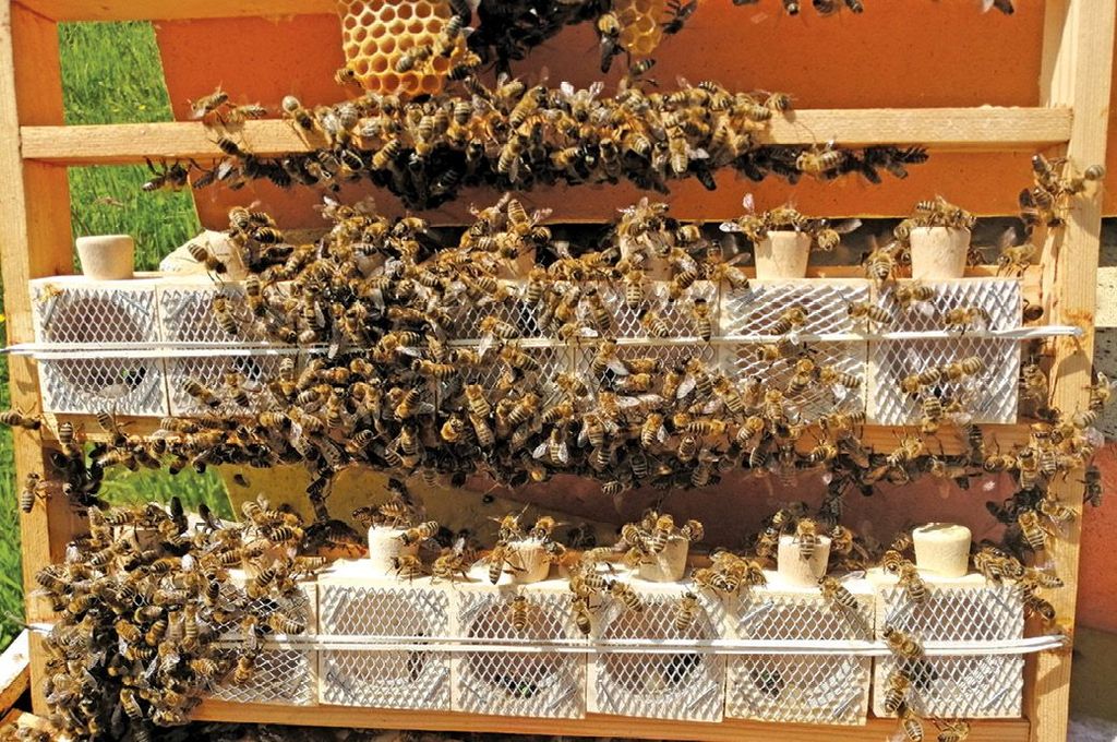Warunki takie możemy zapewnić matce, wkładając ją bezpośrednio po zabiegu do klatki z dużą ilością pszczół (ok. 25 robotnic) lub do ulika weselnego.