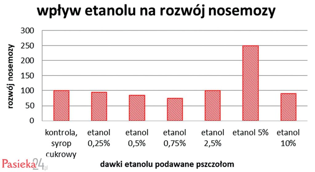 W przeprowadzonych eksperymentach pszczoły zdrowe i zakażone nosemozą dostawały syrop cukrowy (1:1) z dodatkiem etanolu, w następujących stężeniach: 10%, 5% i 2,5%, 0,75%, 0,5%, 0,25%, a pszczołom kontrolnym podawano syrop cukrowy bez dodatku etanolu.