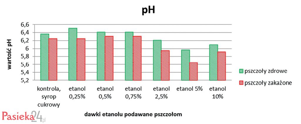 Dodatek etanolu miał również wpływ na obniżenie pH pszczół, czyli zakwaszenie ich organizmu (ryc. 3). U pszczół i innych owadów, podobnie jak u ludzi, etanol jest metabolizowany przez dehydrogenazę alkoholową do bardzo toksycznego aldehydu octowego, który następnie przekształca się w octan metylu. Produkty metabolizmu alkoholu mogą zaburzać równowagę kwasowo-zasadową i powodować zakwaszenie organizmu. Zakwaszanie pszczół obserwowane było jako obniżenie poziomu pH (ryc. 3) i korelowało ze wzrostem poziomu nosemozy (ryc. 2).