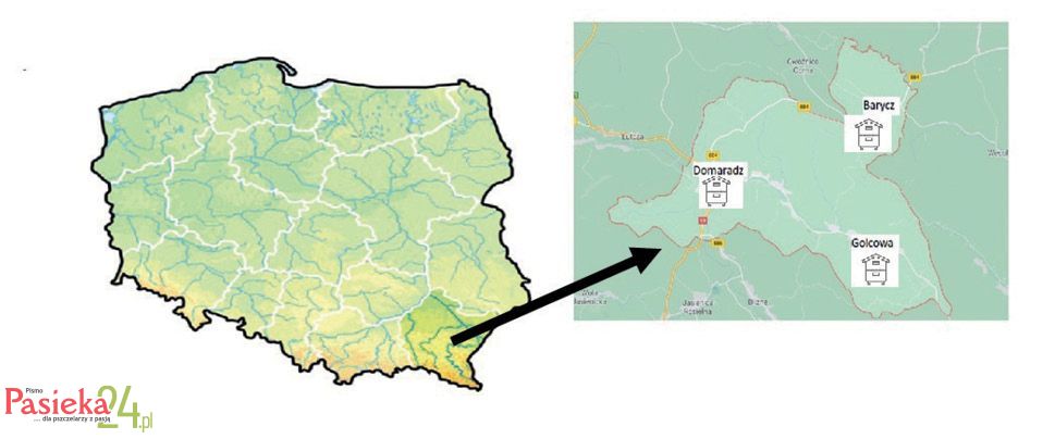 Autorskie badania mikroskopowe nad miodami wierzbowymi i z drzew owocowych (śliwowe) zostały przeprowadzone w obrębie trzech stanowisk zlokalizowanych w gminie Domaradz (ryc. 1.).