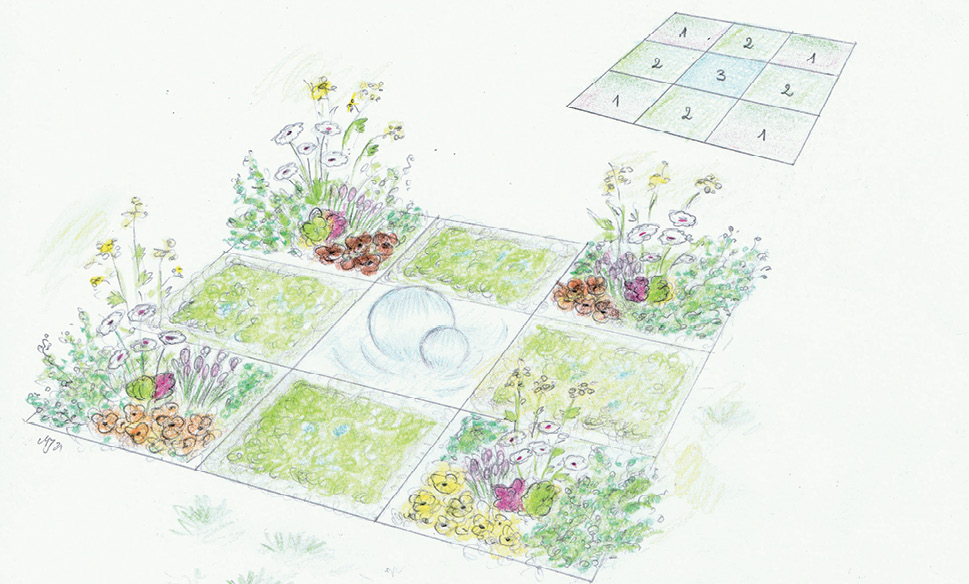 Jest to kompozycja eklektyczna, inspirowana ogrodami renesansowymi. Aranżacja na planie kwadratu podzielona jest na 9 mniejszych, kwadratowych kwater o powtarzających się zestawach roślin: kwatera 1 – marchew, szczypiorek, fiołek ogrodowy (bratek) – odmiany w różnych odcieniach jednego koloru lub grupy kolorów (tu: od brązów, przez rudości i pomarańcze, do żółcieni), lubczyk, sałata (odmiany o jasnozielonych i brunatnobordowych liściach), majeranek, kwatera 2 – płytkie oczko, w którym rośnie rukiew wodna, kwatera 3 (środkowa) – oczko wodne z fontanną. Jasne, wyraziste kolory współgrają z poruszającą się wodą, a zmieniające się odcienie bratków tworzą głębię.