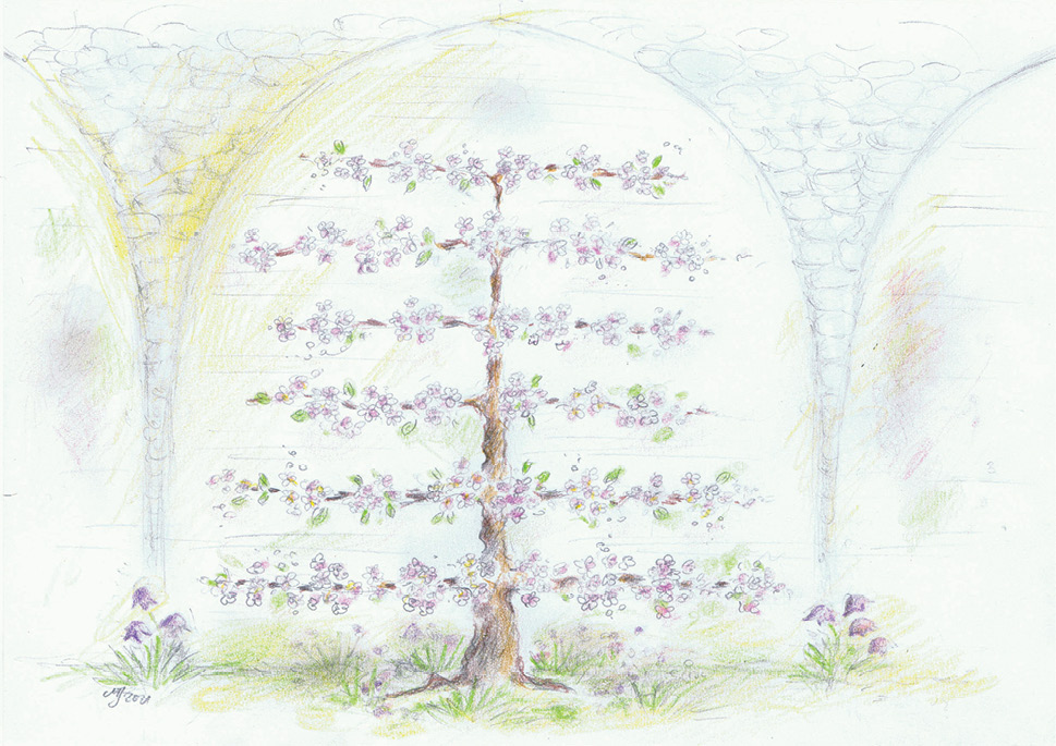 Ryc. 3. Jabłoń prowadzona na starym murze w kompozycji z sasankami.