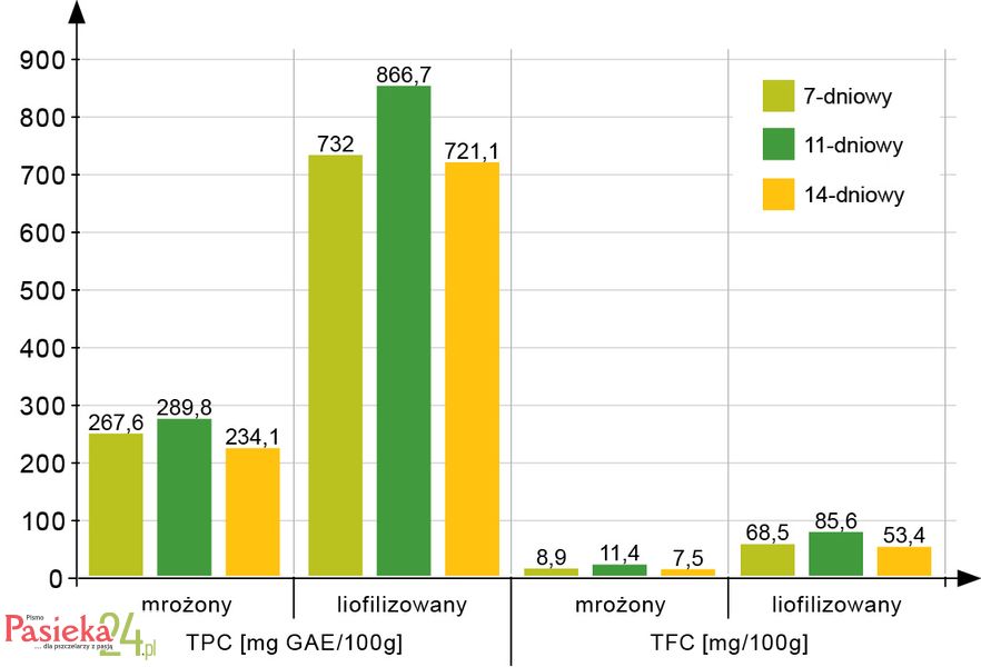 Analogiczne wyniki uzyskał Silici [2019], badając aktywność antyoksydacyjną 7-dniowego czerwiu trutowego podanego liofilizacji. Cytowany autor wykazał dla czerwiu pochodzącego z Turcji całkowitą zawartość polifenoli (TPC) na poziomie 834,05 mg GAE/100 g, a wartości wskaźnika DPPH na poziomie 80%. Rezultaty badań są porównywalne z wynikami uzyskanymi dla czerwiu z pasiek podkarpackich.