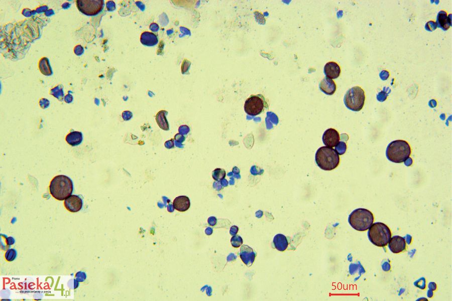 Fot. 5. Typowy osad miodowy miodu gryczanego. Zdjęcie mikroskopowe przy powiększeniu 10×. Preparat barwiony.