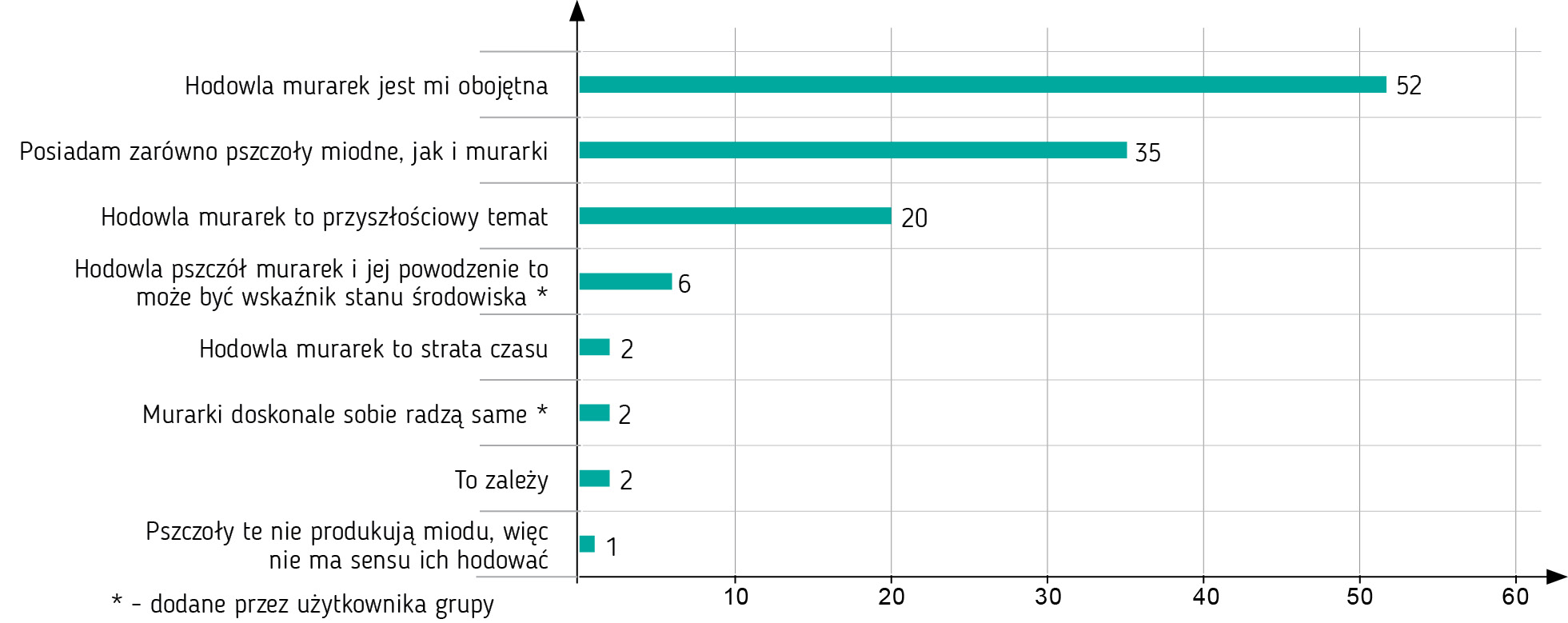 Przeważały opinie obojętne, jednak znaczny odsetek pszczelarzy pochwalił się, że hoduje zarówno pszczoły miodne, jak i murarki. Trzeba na wstępie zaznaczyć, że możliwe, iż w ankiecie takich osób była nadreprezentacja, gdyż prawdopodobnie pszczelarze posiadający murarki, żywiej reagowali na pytania, gdyż mieli coś do powiedzenia na ten temat. I zapewne wielu członków grupy zignorowało ankietę, gdyż murarki ich nie interesują. Niektórzy nie głosowali, ale byli zainteresowani tematem, dopytując o hodowlę pszczół samotnic. Niemniej wyniki dają do myślenia.