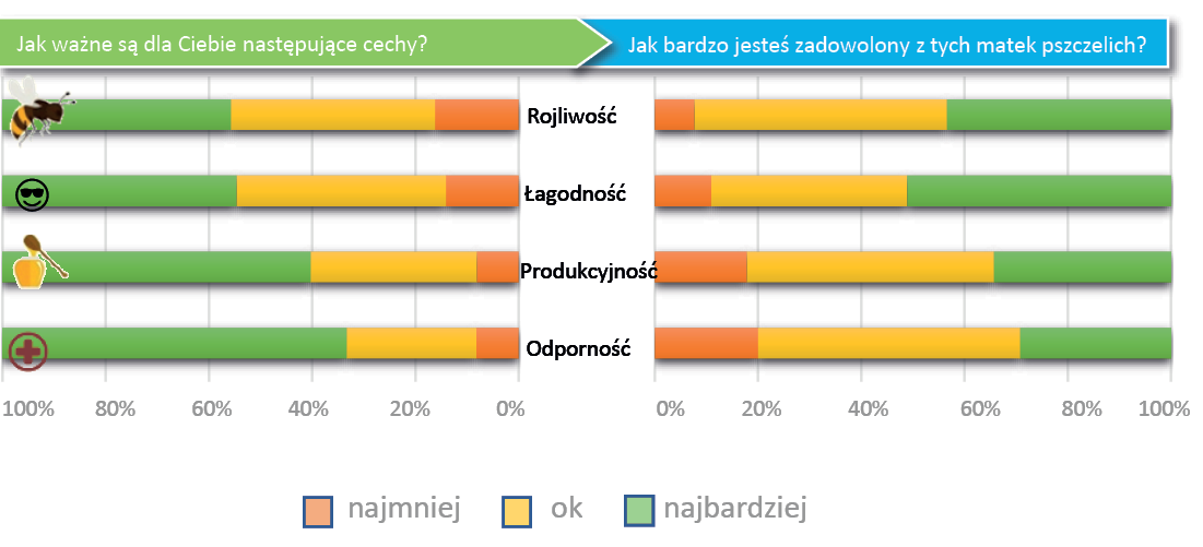 Rys. 2. Oczekiwania dotyczące cech użytkowych matek pszczelich i poziom zadowolenia pszczelarzy (wyniki ankiety przeprowadzonej wśród 396 pszczelarzy z krajów UE).