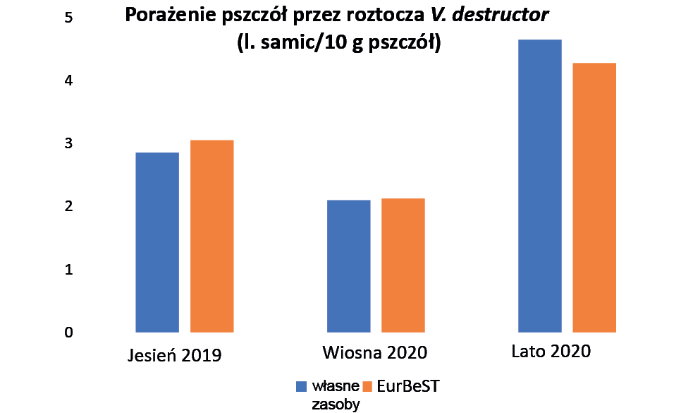 Populacje pszczół, wytypowane przez konsorcjum EurBeST do przeprowadzenia oceny, miały podobne wartości wskaźników przeżywalności jak pszczoły własne. O ile w przypadku cech użytkowych (produkcja miodu, zachowania obronne i skłonność do rojenia się) nie odnotowano większych różnic między ocenianymi populacjami, to pszczoły linii EurBeST pod względem porażenia przez roztocze początkowo wyraźnie przewyższały rodziny własne pszczelarzy komercyjnych (rys. 4).