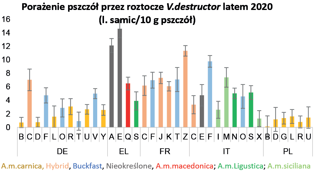 Rys. 5. Po zakończeniu sezonu, pomimo braku leczenia, kilka z linii EurBeST wykazało stopień porażenia przez V. destructor poniżej 3% (kody jednoliterowe – nazwy linii wytypowanych przez EurBeST; kody dwuliterowe – nazwy krajów).