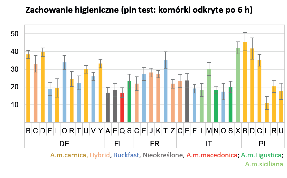 Rys. 6. Zachowanie higieniczne (pin test) wśród pszczół różnych linii wyselekcjonowanych w EurBeST.