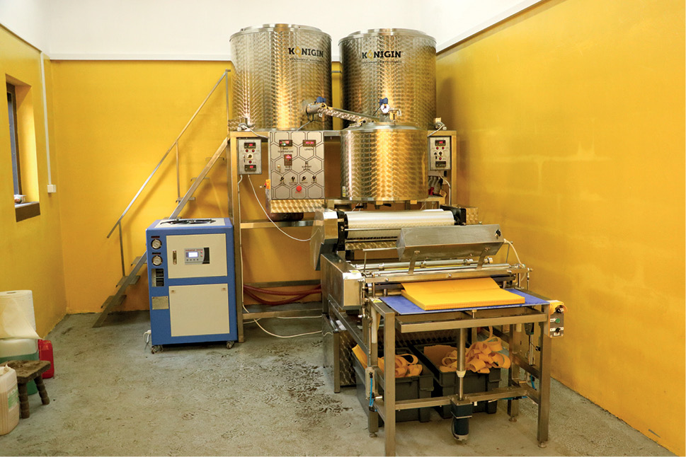 W trakcie podróży po Polsce natrafiłem na dość ciekawy i, moim zdaniem, inspirujący przykład instalacji do produkcji węzy (fot. 2). Właściciele gospodarstwa pszczelarskiego zdecydowali się na zakup linii i wyrób węzy z uwagi na loteryjną jakość tego produktu na rynku. Wcześniej wytwarzali ją metodą prasowania. Jednak od kilku sezonów zużywają rocznie ok. 500 kg węzy, więc potrzebne okazało się wydajniejsze rozwiązanie.