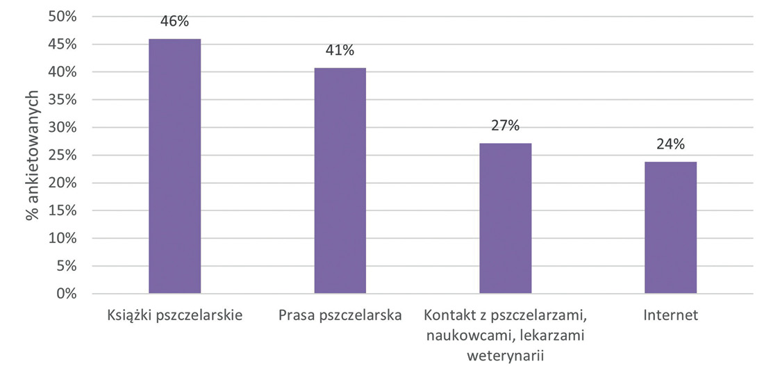 Dopiero na trzecim miejscu pszczelarze wybrali „pogłębienie wiedzy pszczelarskiej”. Mimo takiego obrazu sytuacji, najczęściej wyszukiwanymi tematami przez pszczelarzy w 2020 r. były „zwalczanie pasożyta Varroa destructor” i „zdrowie pszczół”, więc można wnioskować, że respondenci nie mają jednak wystarczającej wiedzy na te tematy.