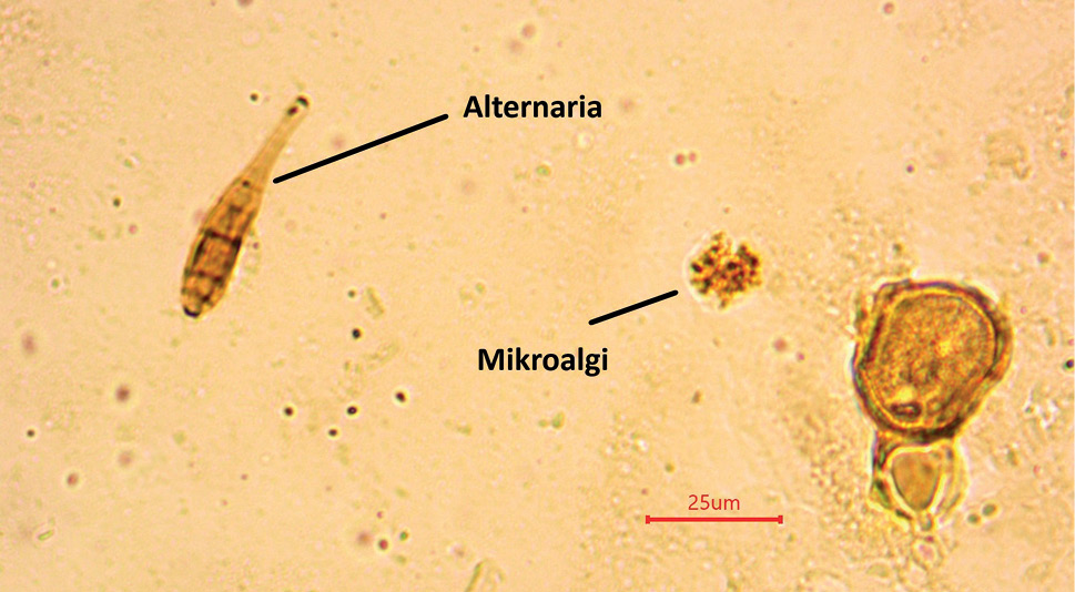 Fot. 3. Obraz mikroskopowy osadu miodu spadziowego z charakterystycznymi oznakami spadzi, obecne mikroalgi oraz zarodnik grzybów pleśniowych z rodzaju Alternaria. Fot. Marta Burzyńska