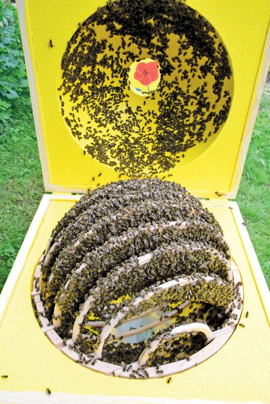 Ramki wycinałem sam ze sklejki 12 mm. Zajęło mi to 14 dni, ponieważ była to bardzo precyzyjna praca i chciałem to zrobić jak najlepiej. Dwie środkowe ramki zostały zaopatrzone w drut pszczelarski, bo mają średnicę aż 52 cm i obawiałem się, że plastry mogą się zerwać pod własnym ciężarem. Wszystkie beleczki posmarowałem woskiem pszczelim, a do dwóch największych ramek włożyłem węzę (od góry ramki). Następnie pszczoły wypełniły ramki wolną zabudową. Obie rodziny zabudowały całą przestrzeń ula w ciągu trzech tygodni. Dokarmiałem je roztworem cukru i wody w stosunku 1 : 1, ponieważ nie było pożytku. W następnym sezonie rodziny otrzymają jeszcze po jednym korpusie, żeby nie powstał nastrój rojowy, a pszczoły miały gdzie składać miód.