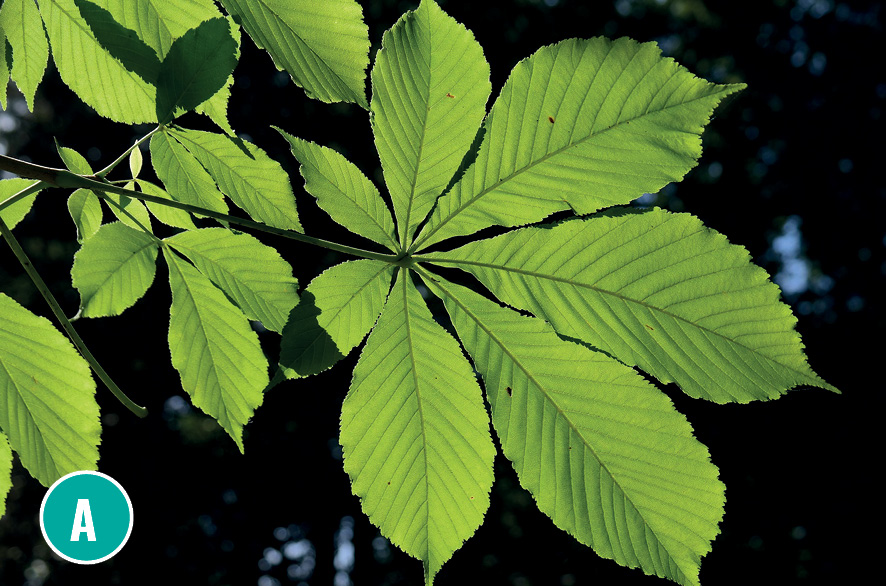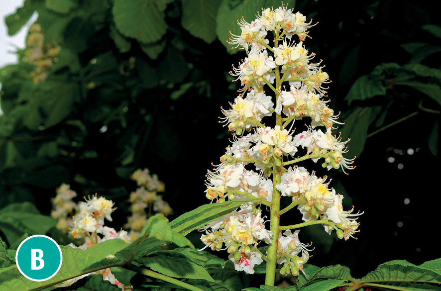 Fot. 2. Kasztanowiec zwyczajny: A – liść, B – kwiat, C – nasiona.