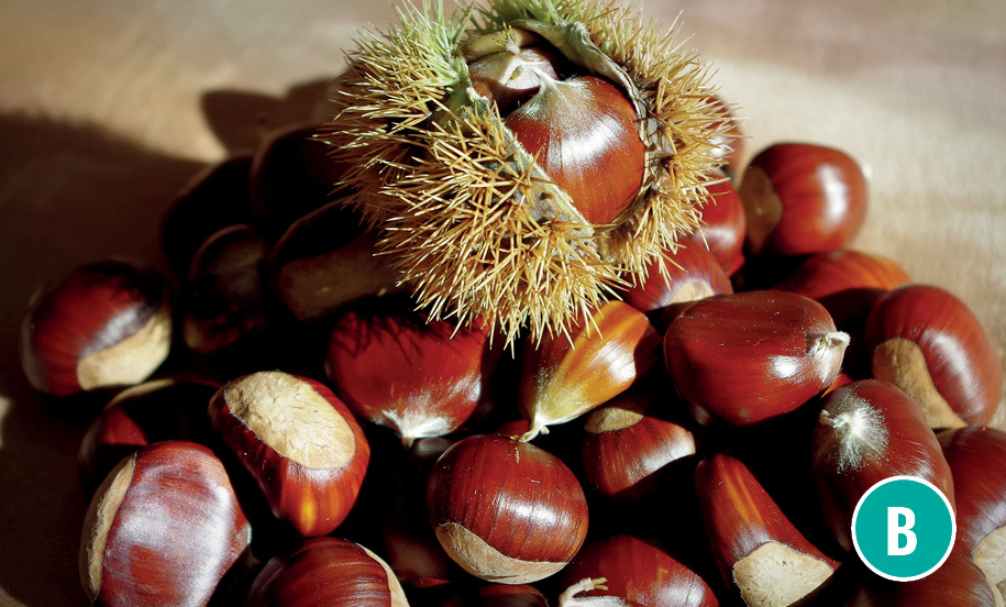 Kasztan jadalny: A – widoczne kwiaty, liście i owoce, B – nasiona.