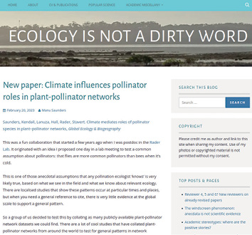 Na blogu „Ecology is Not a Dirty Word” profesorka Manu Saunders z Australii popularyzuje własne badania naukowe oraz przemyślenia dotyczące owadów, ekologii zapylania i biologii pszczół, czyli tego, w czym naukowczyni się specjalizuje. Jeden z ostatnich wpisów poświęciła najnowszej publikacji, dotyczącej badań, w których brała udział jako jedna z członkiń zespołu badawczego. Analiza różnych badań dotycząca sieci zapyleń1 na świecie w odmiennych klimatach w kontekście porównania zapylania owadów należących do błonkoskrzydłych, muchówek, motyli i chrząszczy wykazała, że klimat silnie wpływa na aktywność zapylania tych grup owadów. W strefie klimatu tropikalnego sieci zapyleń zdominowane są przez różne pszczoły i muchówki nienależące do bzygowatych. W strefach suchych prym wiodą pszczele i niepszczele błonkoskrzydłe, jak również muchówki nienależące do bzygowatych. W strefach umiarkowanych królują pszczoły, ale już w strefie kontynentalnej i polarnej rządzą pszczoły oraz muchówki należące do bzygowatych i niebzygowatych. Wyniki te dają empiryczne wsparcie dla hipotezy, że różne „muchy” i ich krewniacy mogą być ważniejszymi zapylaczami w chłodnych strefach klimatycznych.