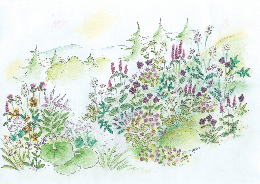 Aranżacje różnią się charakterem. Są odmienne wizualnie, a jednocześnie zbliżone pod względem botanicznym, ponieważ czerpią ze wspólnego zbioru roślin typowych dla sądeckich ziołorośli i łąk. Pokazują, jak bogata i zróżnicowana może być – nawet w skali kilku arów – roślinność w miejscach o urozmaiconej rzeźbie i jak wielu mieszanek może być podstawą. Optimum kwitnienia w przedstawionych zbiorowiskach przypada na koniec czerwca i początek lipca – w tym czasie rabaty będą najbardziej kolorowe. W aranżacjach opartych na zdjęciach fitosocjologicznych podałam oryginalną ilościowość gatunków1. Gatunki chronione zaznaczyłam podkreśleniem, a opcjonalne podałam w nawiasach.