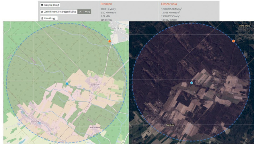 Ilustr. 1. Przykład oszacowania produktywnego zasięgu lotu pszczół z wykorzystaniem darmowych serwisów internetowych. Fot. Marta Burzyńska