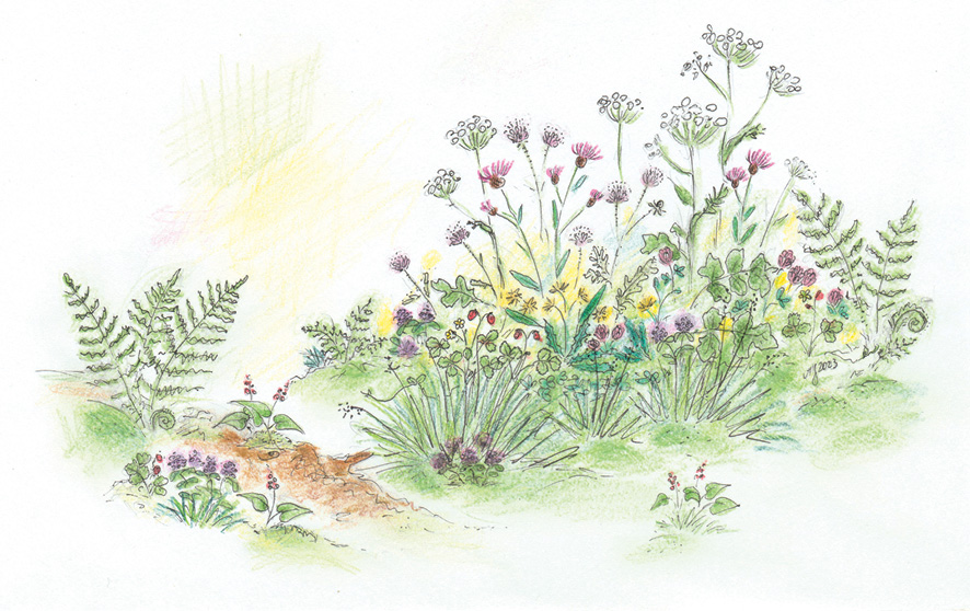 Ta urzekająca aranżacja wprowadza nastrój kwiecistej polanki napotkanej podczas spaceru przez las. Współistnieją w niej rośliny łąkowe: lilioworóżowe chabry i świerzbnice, różowe koniczyny i zielonkawe barszcze, pastwiskowe: fioletowe głowienki i złociste brodawniki oraz leśne: poziomki, konwalijki i paprocie, tworząc razem pachnącą, pełną różnorodnych odcieni i kształtów mieszankę.