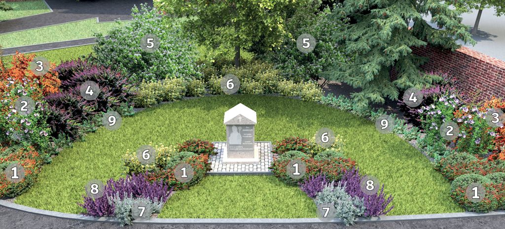 Kolejne gatunki krzewów użyte w tej części projektu to dereń, ognik szkarłatny, hibiskus (bezproblemowo zimujący w naszym klimacie) i berberys. W miejscu, w którym łuk nasadzeń „dobiega” do ścieżki, wysokie krzewy zastąpione zostały niskimi pigwowcami, tak aby zachować widoczność obelisku z jak najrozleglejszej przestrzeni oraz dla komfortu osób poruszających się chodnikiem.
