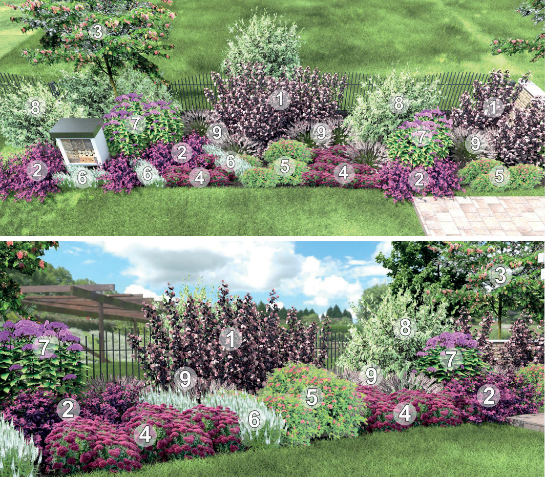 Planowanie takiej aranżacji najlepiej zacząć od wyboru gatunków pod kątem naszych upodobań, wymagań siedliska i wielkości, jakie osiągają rośliny jako dorosłe egzemplarze. Ten ostatni aspekt jest szczególnie ważny, gdyż unikniemy w ten sposób sytuacji, gdy za kilka czy kilkanaście sezonów rośliny zamiast osiągnąć swoje docelowe wielkości, zachowując przy tym swoje charakterystyczne dla gatunku czy odmiany pokroje, zaczną rosnąć w nadmiernym zagęszczeniu, tracić na swojej atrakcyjności i nawzajem się ocieniać. Docelowe rozmiary roślin warto sprawdzać po dokładnej nazwie rodzajowej, gatunkowej i odmianowej w fachowej literaturze albo na zaufanej stronie internetowej, gdyż np. użyta w naszym projekcie odmiana krzewuszki osiąga niewiele ponad 1 m podczas gdy inne odmiany wyrastają na wysokość nawet 3 m. Równie ważne jak wysokości są docelowe szerokości roślin – to one bowiem decydują o tzw. rozstawie nasadzeń. Pamiętajmy, że do osiągnięcia właściwych rozmiarów roślin musimy nieco poczekać, w przypadku bylin – krócej, w przypadku drzew – najdłużej, ale nie należy z tego powodu sadzić roślin w nadmiernym zagęszczeniu.