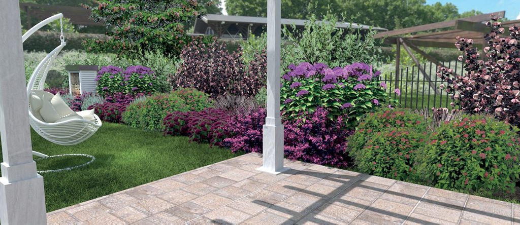 Jeśli, tak jak na przykładzie naszej wizualizacji, ogród nie znajduje się pośród gęstej zabudowy i nie mamy potrzeby szczelnego izolowania się od sąsiedztwa, możemy rozmieścić rośliny tuż przy ogrodzeniu w luźnej rozstawie. W ten sposób nasza kompozycja zyska na lekkości a jednocześnie będzie można obserwować krajobraz poza granicami działki. Widok na otaczającą okolicę, którą dostrzegany poza linią ogrodzenia jest tzw. krajobrazem zapożyczonym i może nadać naszemu ogrodowi nietuzinkowy charakter.