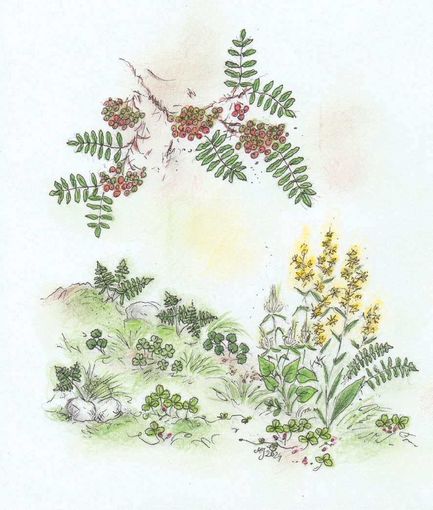 Roślinność przy szlakach na Złotułki inspiruje do tworzenia aranżacji różnych w wyrazie i odmiennych pod względem wizualnym, lecz jednocześnie opartych o wspólną pulę gatunków i układy naturalnie spotykane na tym terenie. Rośliny na rabaty miododajne dobrałam zatem według ich współwystępowania w poszczególnych płatach, a w zestawieniach opartych o zdjęcia fitosocjologiczne podałam oryginalną ilościowość gatunków1.