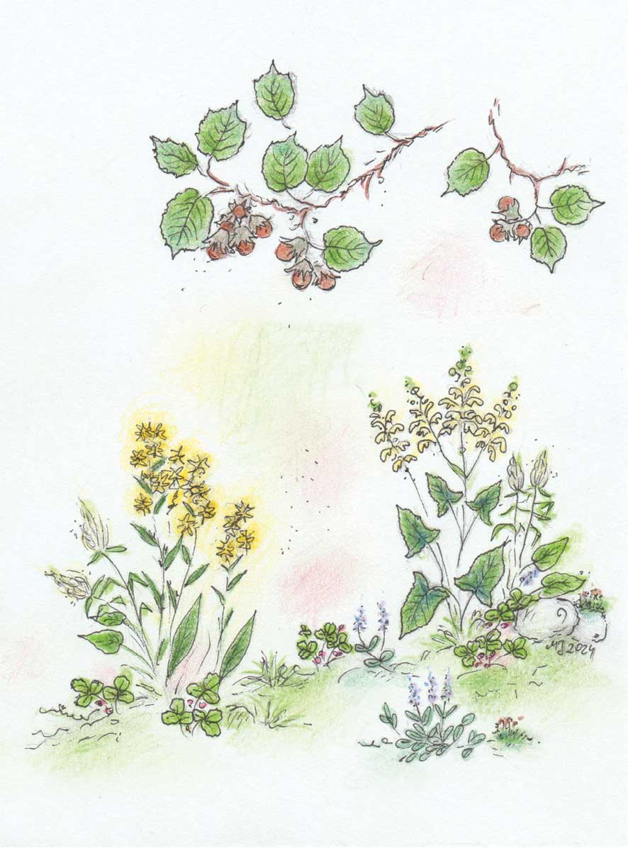 Dobór roślin: leszczyna pospolita Corylus avellana, nawłoć pospolita Solidago virgaurea +, szałwia lepka Salvia glutinosa +, zerwa kłosowa Phyteuma spicatum +, gajowiec żółty Galeobdolon luteum +, przetacznik leśny Veronica officinalis +, poziomka pospolita Fragaria vesca +.