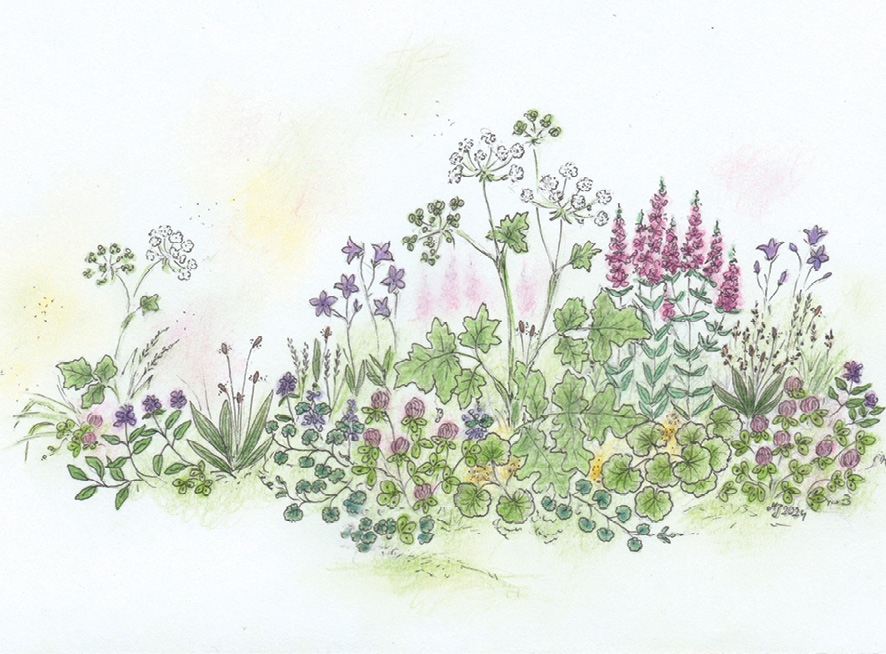 Niedaleko starego sadu, w którym kora drzew pokryta jest przez porosty, łąki ozdobione są amarantowymi pędzelkami ostrożnia łąkowego. Na rabacie przywołującej wspomnienie tych wilgociolubnych zbiorowisk rosną świerząbek o baldachach białych jakby oprószonych różem, ostrożeń z łaciatymi łodygami, cukierkowo różowa firletka, kuklik o brzoskwiniowozłocistych płatkach i bordowym kieliszku oraz drobna błękitna niezapominajka. Niektóre z nich złączone są wąsami czepnymi groszku łąkowego tworząc pyłko- i nektarodajny gąszcz.