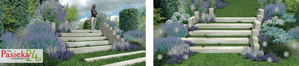 Nasza rabata miododajna miękkimi liniami delikatnych, ażurowych pokrojów roślin otacza schody, co sprawia, że wyglądają one bardzo naturalistycznie. Aby uzyskać ten subtelny efekt, rośliny sadzimy pojedynczo lub po ok. 3 egzemplarze.