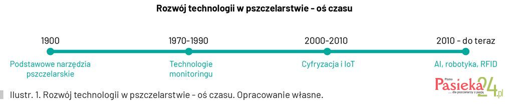 Etapy rozwoju nowoczesnych technologii w pszczelarstwie można podzielić na kilka kluczowych okresów, które odzwierciedlają postęp od tradycyjnych metod pszczelarskich po zaawansowane technologie cyfrowe i automatyzację. Wybrane okresy zaprezentowano w postaci osi czasu na Ilustr. 1.