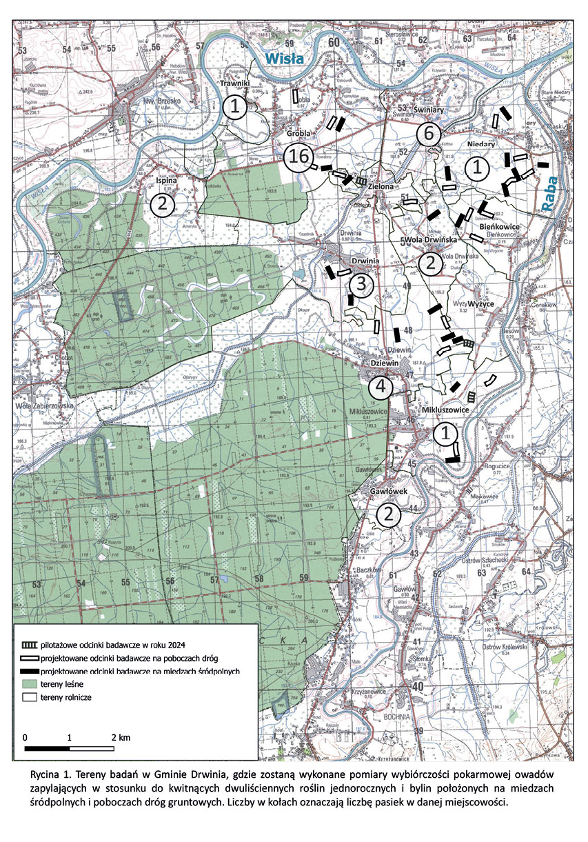 W lipcu 2024 na terenach rolniczych położonych w Gminie Drwinia (woj. małopolskie) wykonano pilotażowy eksperyment, którego celem było poznanie stopnia atrakcyjności poszczególnych gatunków flory występujących na siedliskach marginalnych dla pszczół, trzmieli i motyli. W tym celu na 3 odcinkach poboczy dróg gruntowych, z których każdy miał długość 100 m, wykonano dwukrotny przemarsz, podczas którego notowano liczbę kwitnących gatunków oraz kwiatów dwuliściennych roślin jednorocznych i bylin. Przy pomocy aparatu fotograficznego rejestrowano pszczoły, trzmiele i motyle żerujące na poszczególnych gatunkach kwiatów (Fot. 1a, 1b). Na badanych odcinkach poboczy dróg gruntowych wykazano obecność 3949 kwiatów należących do 26 różnych gatunków roślin. Łącznie zarejestrowano obecność 14 pszczół, 54 trzmieli i 11 motyli. Pszczoły występowały na 6 gatunkach (koniczyna biała, mak polny, pępawa dwuletnia, pięciornik gęsi, powój polny, żmijowiec zwyczajny). Również obecność trzmieli wykazano na 6 gatunkach (bukwica zwyczajna, farbownik lekarski, mak polny, ostrożeń błotny, żmijowiec zwyczajny, żywokost lekarski). Występowanie motyli stwierdzono na 5 gatunkach (maruna bezwonna, ostrożeń błotny, powój polny, przymiotno białe, świerzbnica polna).