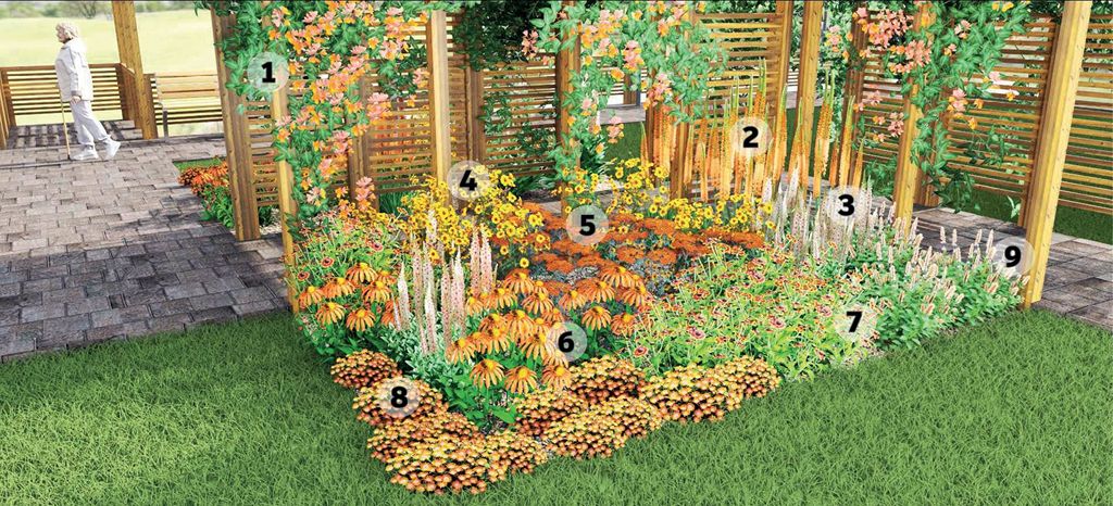 Najjaśniejszą plamę kolorystyczną nasadzenia stanowi uroczo kwitnąca dziewanna w odmianie Honey Dijon z przepięknymi brzoskwiniowymi kwiatami o wyraźnym ciemnym środku. Wysoki nachyłek barwierski w ostrym żółtym kolorze podkreśla kwitnienie innych bylin. Słonecznica i kłosowiec to niskie rośliny. Z bliska w ich pomarańczowych rozkwitłych kwiatach możemy dostrzec delikatne połyski różu. W rogu rabaty pięknymi rudymi pastelami zakwita pustynnik Izabeli – wysoka i wyjątkowa bylina o charakterystycznych długich, pionowych spiczasto zakończonych kwiatostanach. Z przodu rabaty, zaraz za niską słonecznicą, posadzono jeżówkę ‘Orange Skipper’ kwitnącą w kolorze głębokiego pomarańczu. Najciemniejsze plamy barwne na naszej rabacie to dzielżan jesienny i krwawnik ‘Terracota’. Ich bordowe i ciemno-ceglaste kwiaty odcinają się od jaśniejszych barw. Nad całością góruje wspinający się po pergoli milin z kwiatami w kształcie trąbek w ciemnopomarańczowym kolorze.