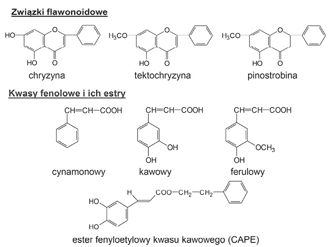 Propolis jest naturalnym produktem o silnym działaniu przeciwdrobnoustrojowym w stosunku do różnych grup drobnoustrojów chorobotwórczych dla człowieka (bakterii, grzybów drożdżopodobnych i pleśniowych oraz wirusów). Głównymi składnikami biologicznie aktywnymi krajowego propolisu z punktu widzenia mikrobiologicznego są flawonoidy, kwasy fenolowe, estry kwasu kawowego (Ilustr. 1). Wpływają one również na inne właściwości biologiczne kitu pszczelego, w tym przeciwzapalne, przeciwbólowe, przeciwnowotworowe, przeciwutleniające.