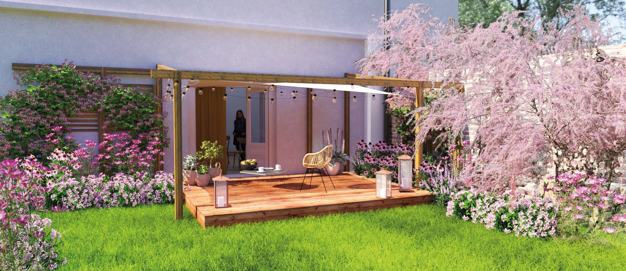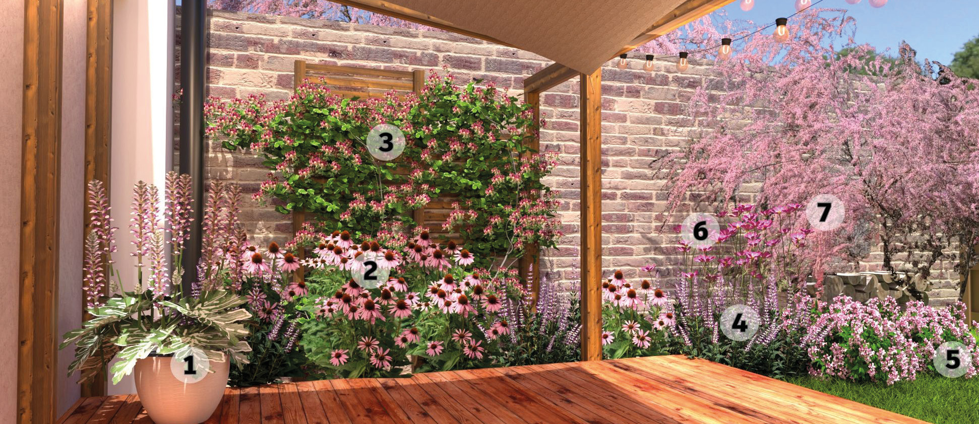 Zaprojektowany „różowy zakątek” to pełen słońca fragment ogrodu okalający taras o wymiarach 3,5 × 4,0 m zlokalizowany tuż przy budynku. Przestrzeń wydzielona jest z jednej strony ceglanym murem. Jak widać na wizualizacjach to między nim a tarasem oraz wzdłuż budynku zlokalizowano nasadzenia. Pod rabaty przeznaczono fragmenty szerokości 1,5 m i długości 3,5 m i 5 m.
