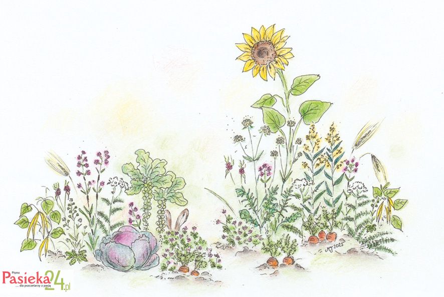 Dobór roślin: świerzbnica polna, barszcz zwyczajny, lebiodka pospolita, dzwonek brzoskwiniolistny, rzodkiewnik pospolity, szczeć pospolita, chaber bławatek, pszenica samopsza, kapusta głowiasta włoska, burak zwyczajny, fasola (np. polska fasola z orzełkiem).