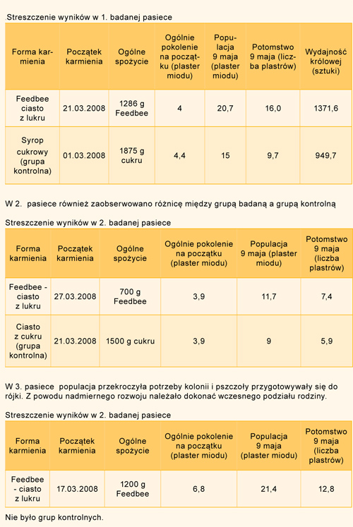 W przypadku ciasta wytworzonego z lukru (1 kg lukru + 1,5 kg Feedbee + 75% syropu) rodziny spożywały średnio 30-40% ilości (750 g – 1 000 g) przeznaczonej na każdą kolonię w ciągu około 2 tygodniu. Ciasto z cukru zachowało miękkość i przez długi czas było łatwo przyswajalne.