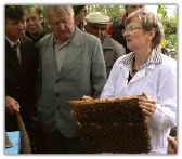 O łagodności pszczół mieliśmy okazję przekonać się sami, kiedy gospodyni otworzyła ule i mimo niesprzyjającej pogody pszczoły nie żądliły. Usłyszeliśmy i zobaczyliśmy różnice w zachowaniu się na plastrach pszczół różnych linii, co w praktyce oznacza pszczoła dobrze trzymająca się plastrów, jak hoduje się trutnie aby zabezpieczyć potrzebną ich ilość do inseminacji (nieraz 2000 dziennie), jak rozpoznać trutnie dojrzałe by nie marnować tych młodych. Wychów prowadzony jest w odkładach, które stale są zasilane czerwiem dla utrzymania właściwej siły i odpowiedniej ilości karmicielek do opieki nad poddanymi larwami. Po zasklepieniu mateczniki przenoszone są do cieplarek, gdzie przebywają do czasu wygryzania się matek.