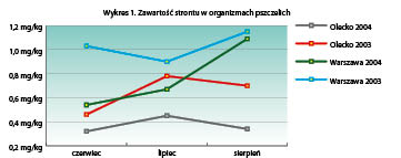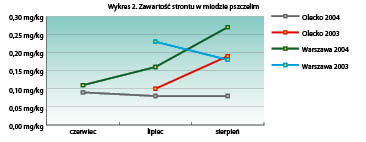 W 2004 roku w regionie Olecka zawartość tego pierwiastka w czerwcu wynosiła 0,09 mg/kg, w lipcu i sierpniu 0,08 mg/kg, a w regionie warszawskim zawartość rosła od 0,11 w czerwcu, przez 0,16 w lipcu, do 0,27 mg/kg w sierpniu.Wykres nr 3 pokazuje zawartość strontu w próbach pierzgi. Pierzgę i propolis pobierałem jednokrotnie w czasie sezonu pszczelarskiego, w czerwcu.